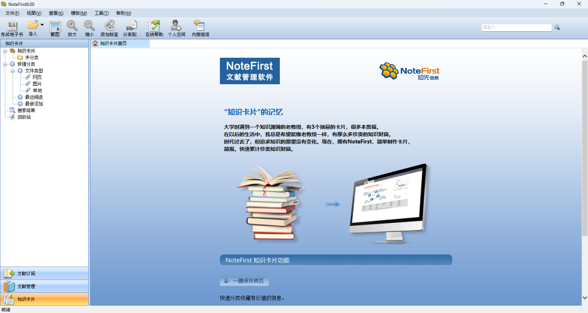 知识卡片。NoteFirst 可将有价值网页部分一键收藏为知识卡片,把知识管理扩展到文献之外,并支持打包成电子书,便于高价值信息的永久保存和分享。