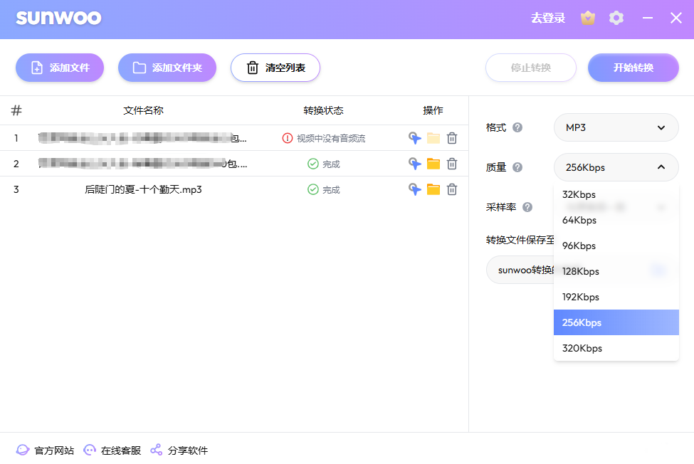 sunwoo音频格式转换器支持对音频进行精细的调整,包括比特率、质量、采样率等参数,满足专业音频编辑需求。注意:如果原音频文件比特率较低,提高质量不会改善音质。