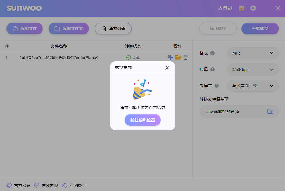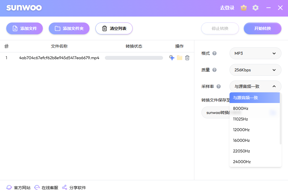 sunwoo音频格式转换器是一款专业音频格式转换工具,支持 MP3、OGG、WAV、AAC、FLAC 等多种音频格式转换,支持视频提取音频,支持批量转换,可定制化音频质量、比特率、采样率等参数,软件操作简单,方便快捷。