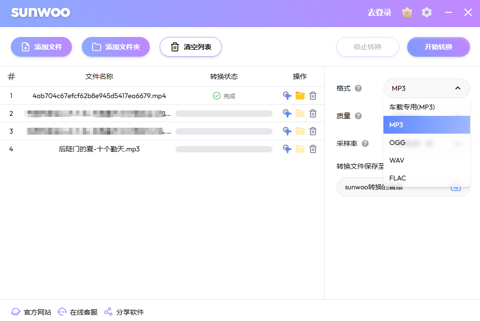 sunwoo音频格式转换器不仅支持 MP3、MP4、WAV、FLAC、OGG、MOV、AVI 等主流音视频格式,也支持各平台的音频转换,一键拖拽导入;支持转换的目标格式有:MP3、OGG、WAV、FLAC,特别提供了车载 MP3 格式,兼容老旧车载播放器。