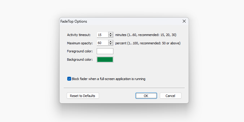 FadeTop是一款优秀的电脑开关定时提醒软件,软件可以自定义每隔一段时间,让电脑屏幕使用淡入淡出的视觉效果来显示当前系统时间,且占满整个电脑屏幕,提醒您到时间休息了。在经过自定义的时间后,电脑屏幕可以继续操作。