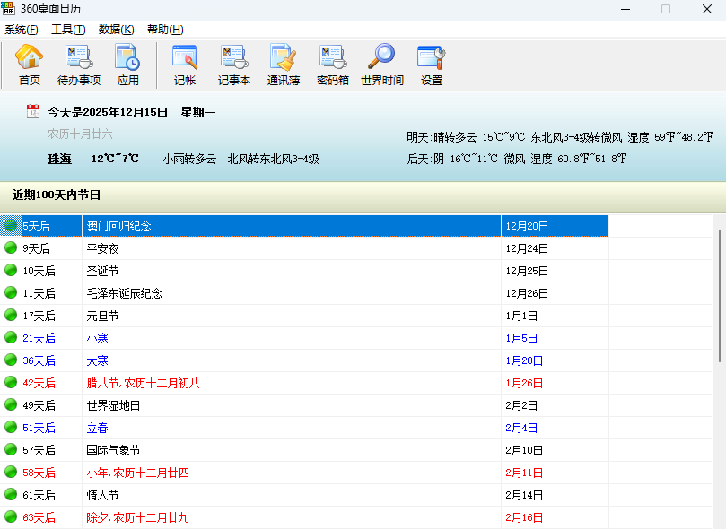 360桌面日历是一款精美的电脑日历软件,功能包括世界各地时间查询,天气查询、记帐,通讯薄,密码箱与备忘录等超强日程管理功能,能够设定提醒,使用方便。