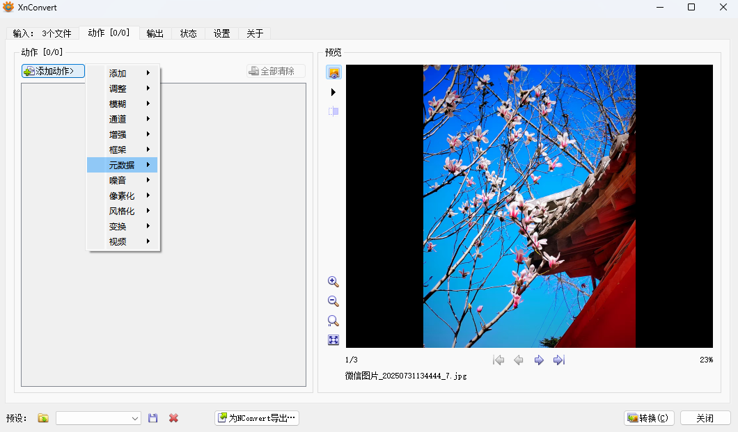 XnConvert是一款批量图像格式转换软件,允许自动编辑照片集:可以旋转,转换和压缩您的图像,支持常见的图片和图形格式(JPEG、TIFF、PNG、GIF、WebP、PSD、JPEG2000、JPEG-XL、OpenEXR、camera RAW、AVIF、HEIC、HEIF、PDF、DNG、CR2)。可以保存预设并在另一个预设中重复使用批量图像转换,用户们还可以轻松的实现图像格式的转换、缩放图像比例、添加滤镜特效、水印等等。