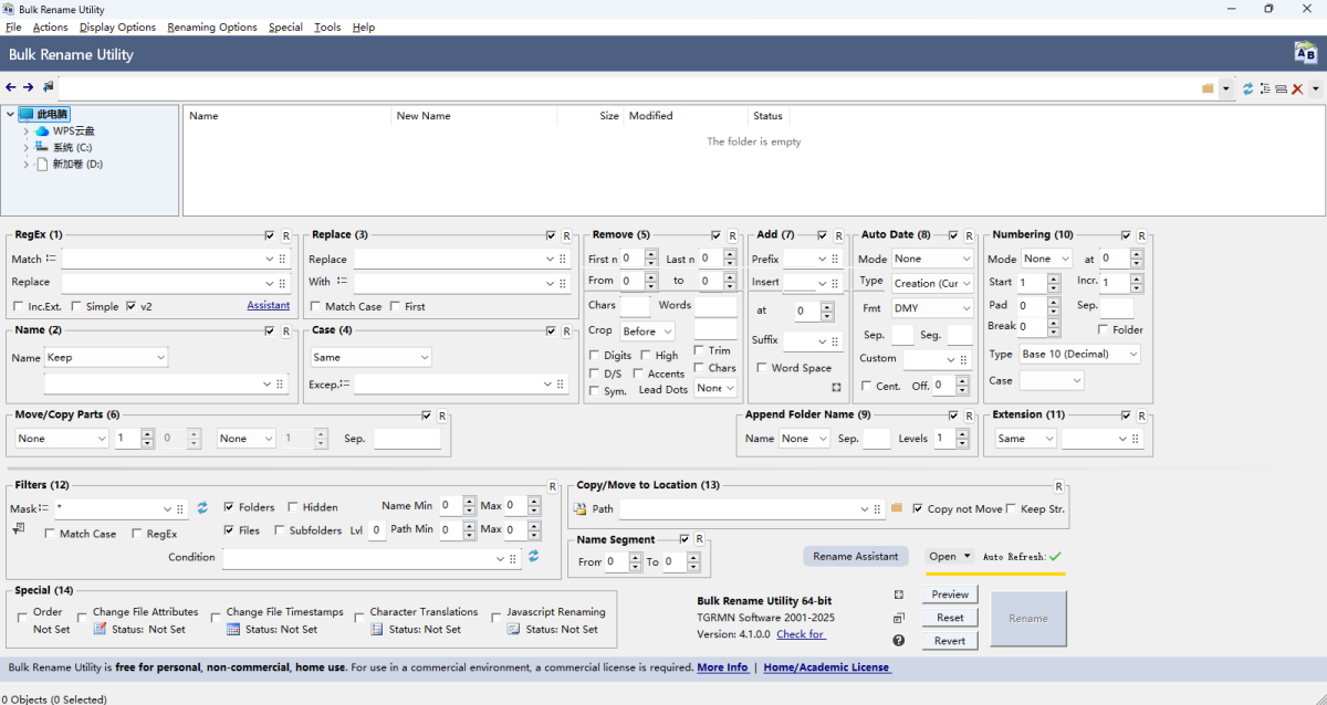 Bulk Rename Utility是一款文件重命名工具,可以灵活轻松地重命名文件或整个文件夹,还拥有添加日期/时间戳、替换数字、插入文本、转换大小写、添加自动编号、处理文件夹和子文件夹等功能。