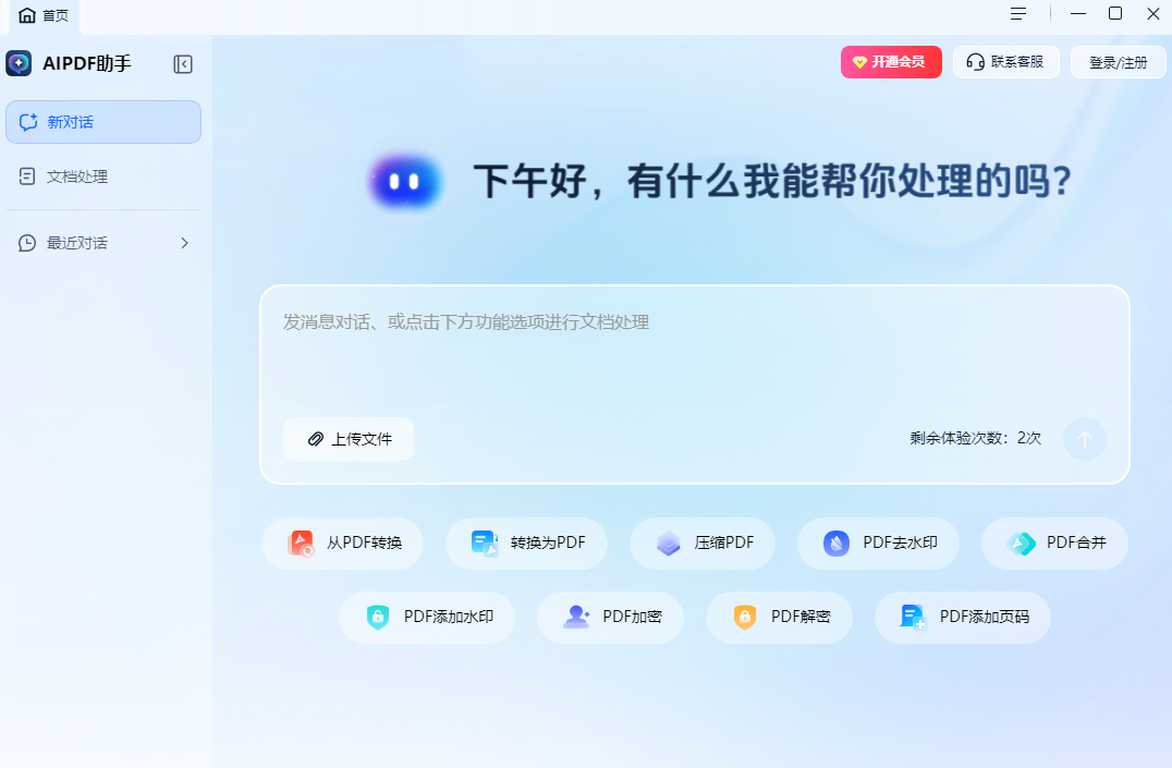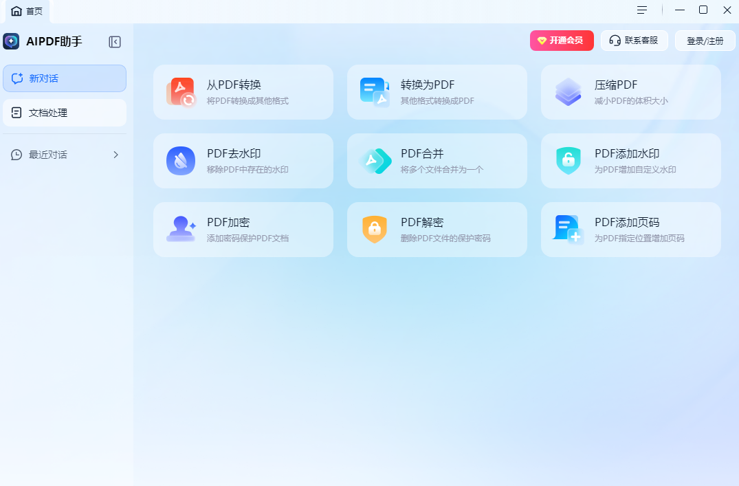 AIPDF助手是一款操作简单的智能PDF文件处理软件。告别传统PDF文件处理流程,结合智能AI技术,让用户通过简单的对话框,一句话就可以实现PDF编辑、PDF合并、PDF压缩、PDF解密、PDF加密、PDF插入页码、PDF转其它、其它转PDF、PDF去水印、PDF加水印等操作,一键即可帮助用户提升办公效率。