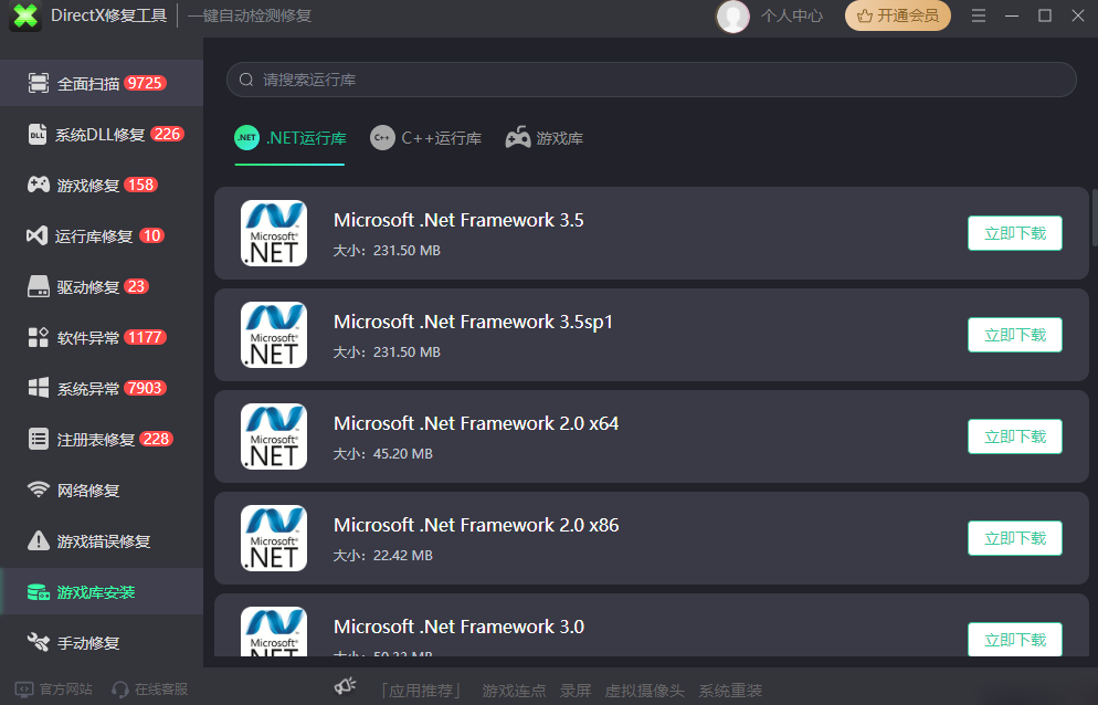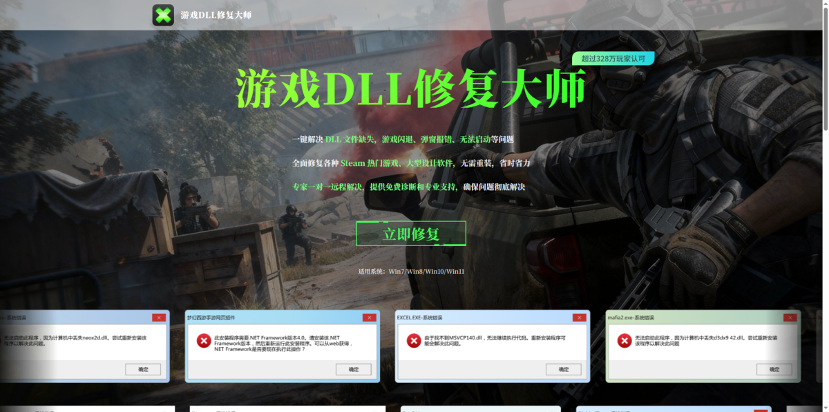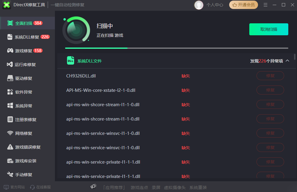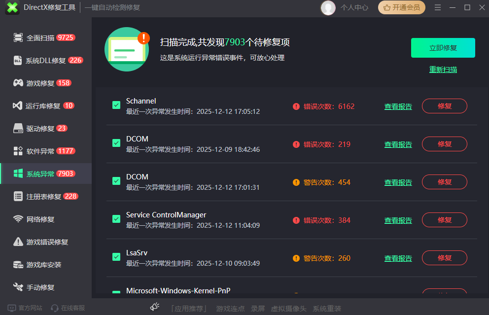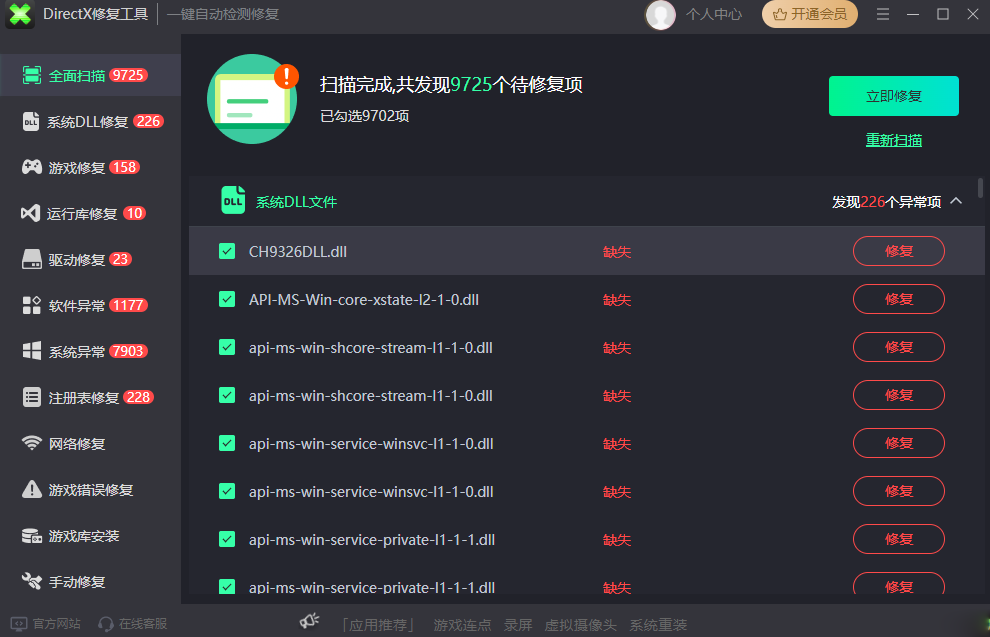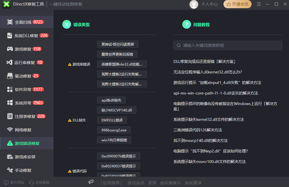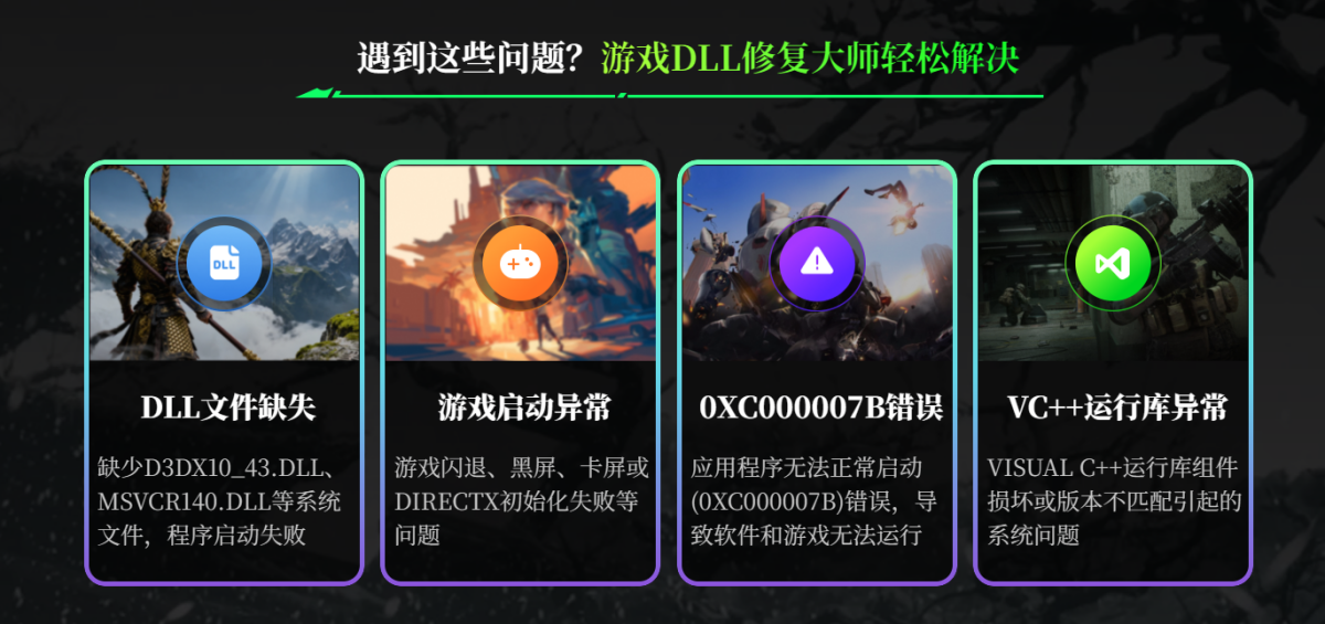 游戏DLL修复大师是一款专门用于解决Windows系统中因DirectX组件损坏或动态链接库(DLL)文件缺失、损坏所导致问题的工具软件。它能够自动检测系统运行库的完整性,并一键下载安装缺失的修复文件,帮助用户快速解决游戏、专业软件等应用程序因依赖环境不完整而出现的闪退、报错或无法启动等问题,使系统恢复健康运行状态。