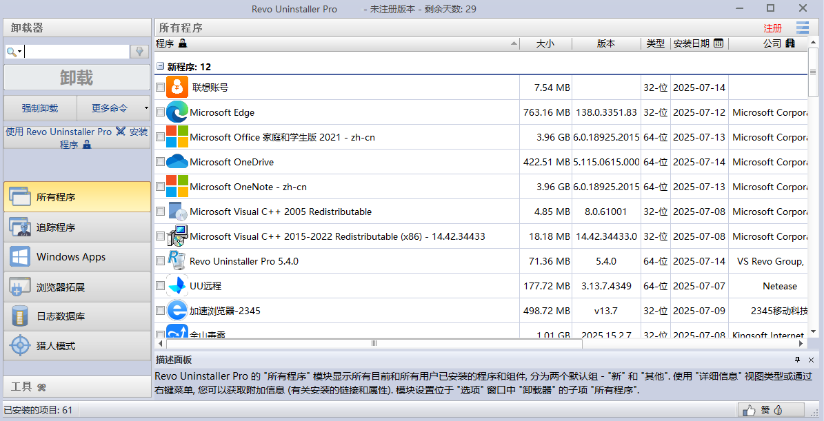 卸载模块是Revo Uninstaller的主要功能,适用于程序无法正常卸载或您怀疑程序未完全卸载的情况。