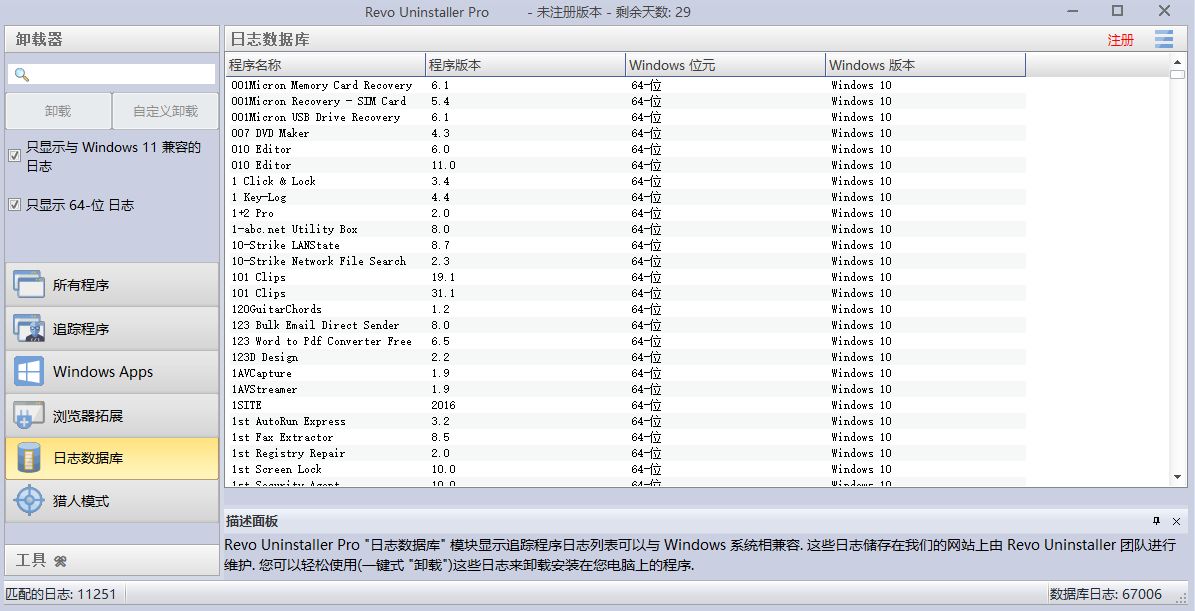 Revo Uninstaller Pro的日志数据库是许多不同程序的跟踪日志的一个大集合。这些日志是由我们的团队使用实时监控功能创建的,并存储在我们的服务器上。它们的行为与用户自己创建的跟踪日志完全相同,可以用来卸载程序或进行额外的清理,以备怀疑还有残留项或作为故障排除步骤。