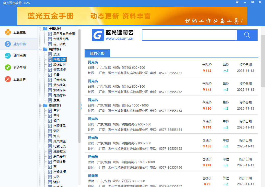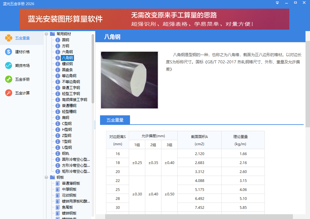 蓝光五金手册软件为免费软件,提供建设行业常用五金材料理论重量、规格、密度、计算公式、市场价格等信息。国内首创技术,实时、动态更新,无需升级软件就可以轻松获取最新五金资料。