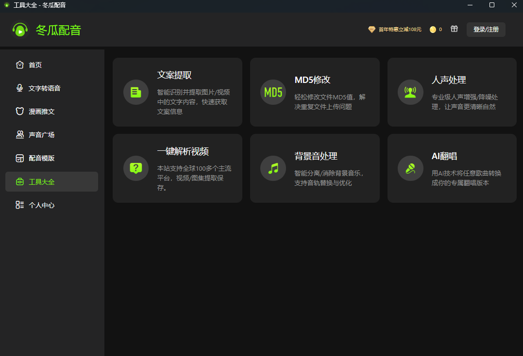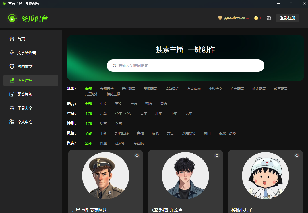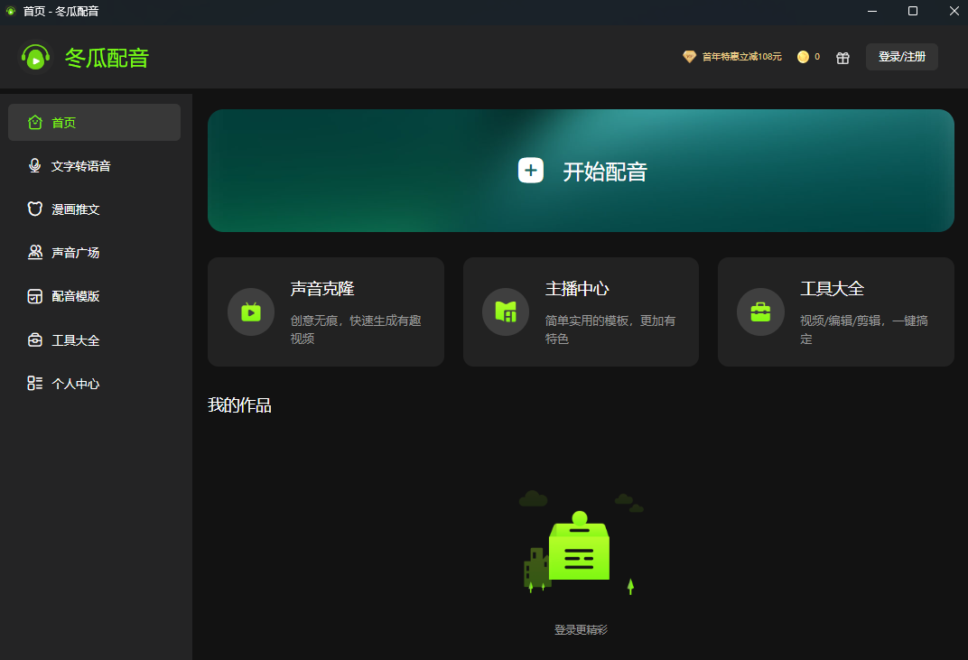 冬瓜配音是一款专业的在线将文字转语音的AI配音软件,提供AI配音,声音克隆、漫画推文、文案提取、人声处理、背景音处理等功能,只需输入文本内容即可一键合成语音,可快速实现文本朗读、视频配音、广告、课件、影视解说等的配音工作,是一款功能强大的AI在线配音生成器。