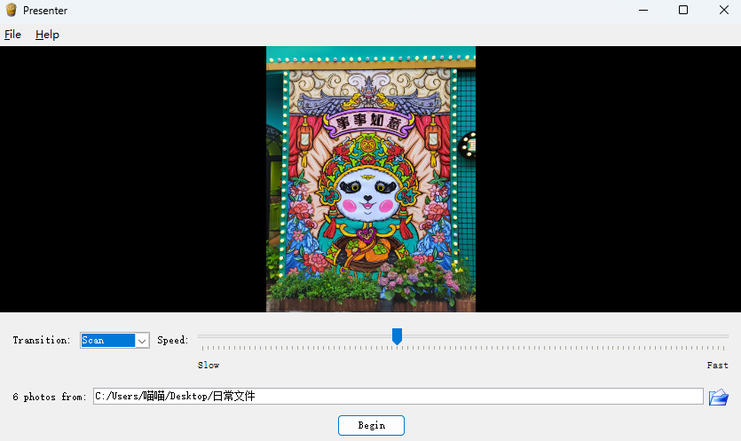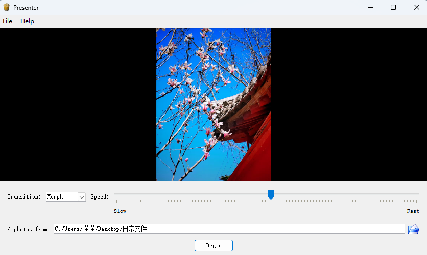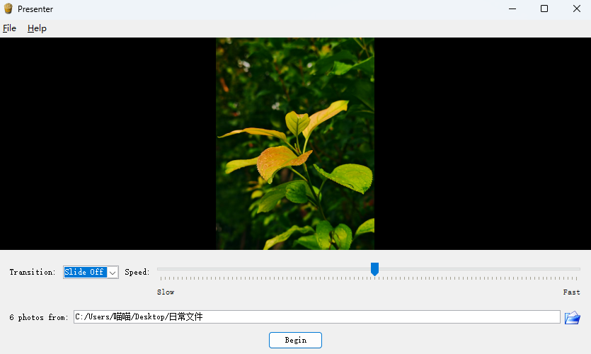 Presenter是一款好用的看图工具,只需指定照片集的所在文件夹,便可自动使用幻灯片的方式播放图片,还可以自选图片的转场效果,播放速度也可自由调整,完全省去手动的麻烦,相当方便。