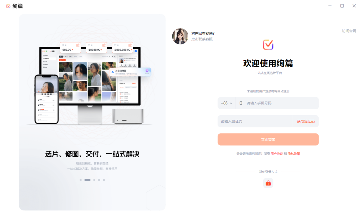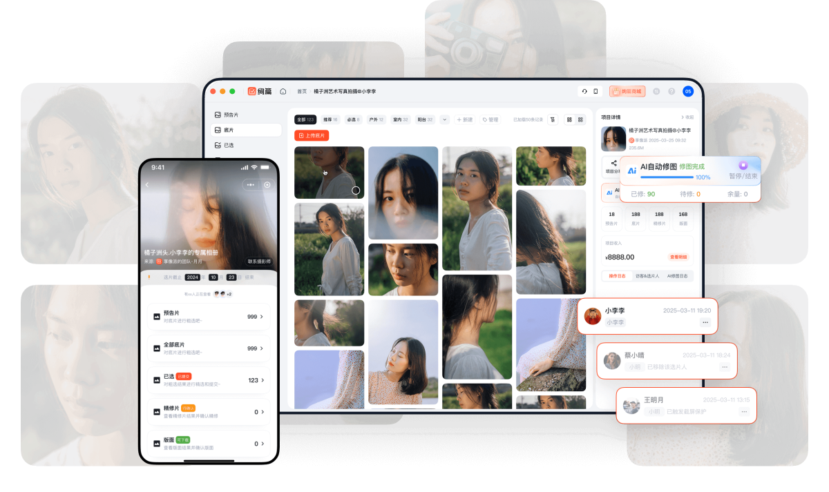 绚篇是专为旅拍摄影师/工作室/影楼打造的AI智能选片交付平台,实现"拍摄即上传·选片即交付·交付即收款"全流程闭环。通过极速传输、AI修图、版权保护三大核心技术,解决旅拍场景中选片效率低、沟通成本高、二次销售难等痛点。