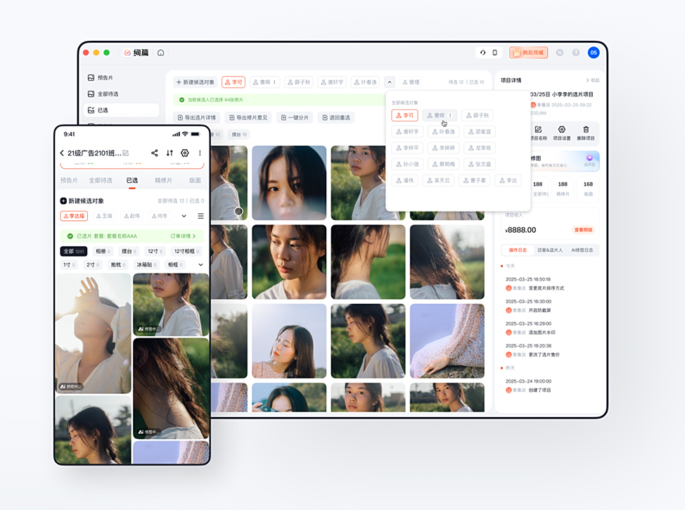 旅拍跟拍即时选片、幼儿园毕业册选片、中小学/大学毕业纪念册选片、婚纱摄影/写真选片 、照片售卖、景区摄影摆摊选片、摄影工作室/影楼选片交片等