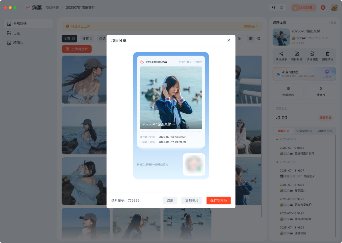 首创"传送门"功能,告别传统6步交付,开启3步极速变现,无需添加客户微信,客户扫码后摄影师即可将照片传送至专属空间