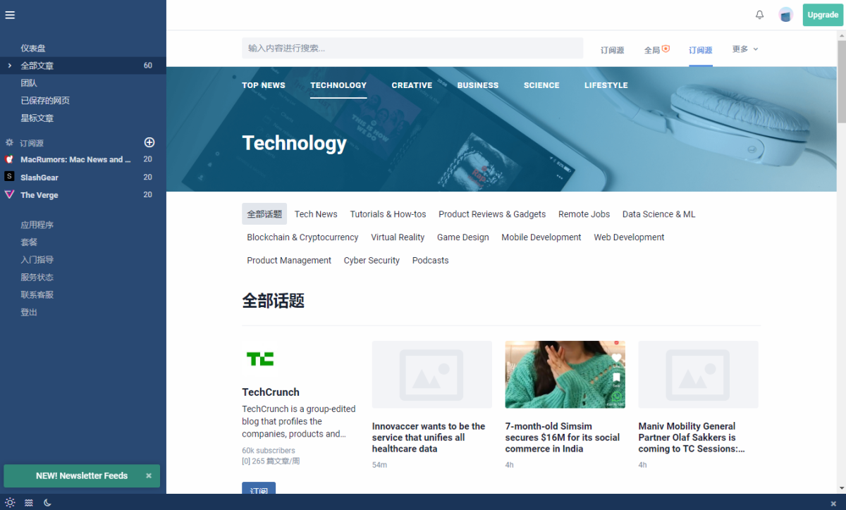 不仅是搜索功能,Inoreader为了让你能够发现更多感兴趣的RSS源,还加入了全新的订阅推荐功能。在添加新订阅时,Inoreader会以类别向你推荐一些优秀的订阅源,目前支持超过50种类别,这个数字还会在未来持续增加。