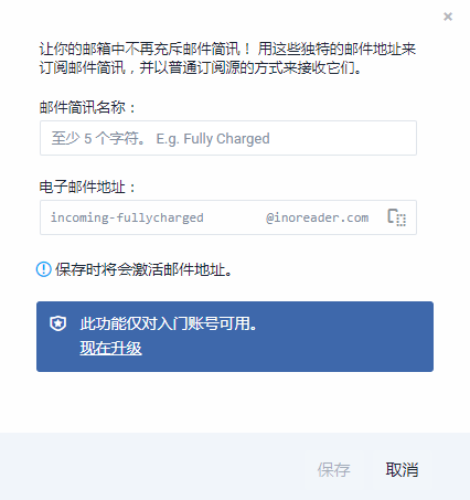 新增的邮件订阅功能解决了邮箱总被订阅邮件填满的问题,我们可以在Inoreader中生成一个专门用于订阅的邮箱,随后在订阅服务中填入该邮箱即可将订阅邮件收集到Inoreader中。