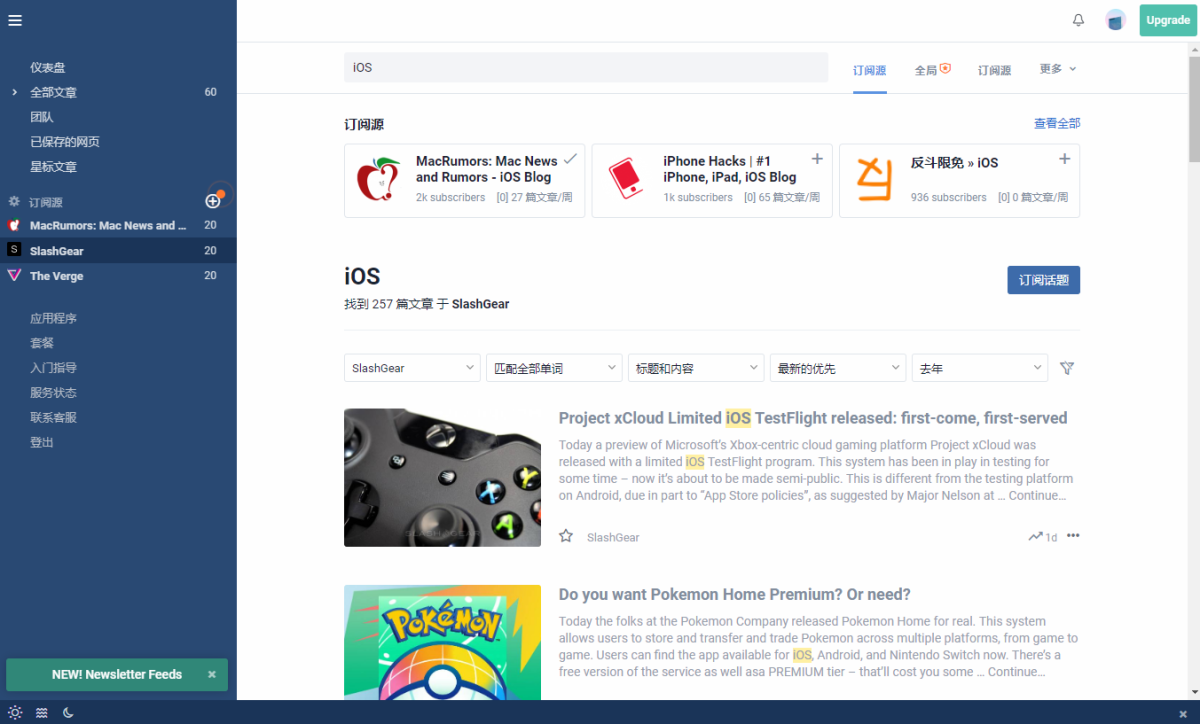 新版的Inoreader对搜索功能进行了重新设计,在保留原本动态搜索、高级语法等功能的前提下,对搜索页面进行了简化,降低了上手门槛。普通用户可以用新的搜索功能找到自己想要的文章和订阅源,进阶用户也可以用它来精确定位到某篇具体文章。