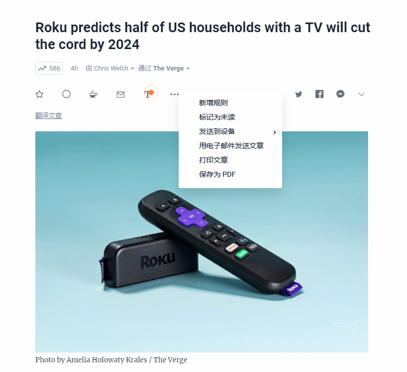 在Inoreader的阅读界面,文章默认会居中展示,增强阅读时的沉浸感。同时,在界面顶部加入的悬浮工具栏让你无需打开设置即可对页面排版进行调整。由于工具栏的加入,你也可以在文章的任意位置进行标记已读、加星等操作。