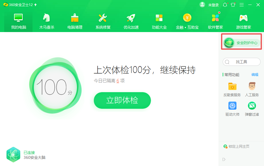 第一步,在电脑的桌面上找到360安全卫士软件,然后双击打开,进入到软件的主界面当中后,我们找到界面右侧的【安全防护中心】功能,并点击进入。