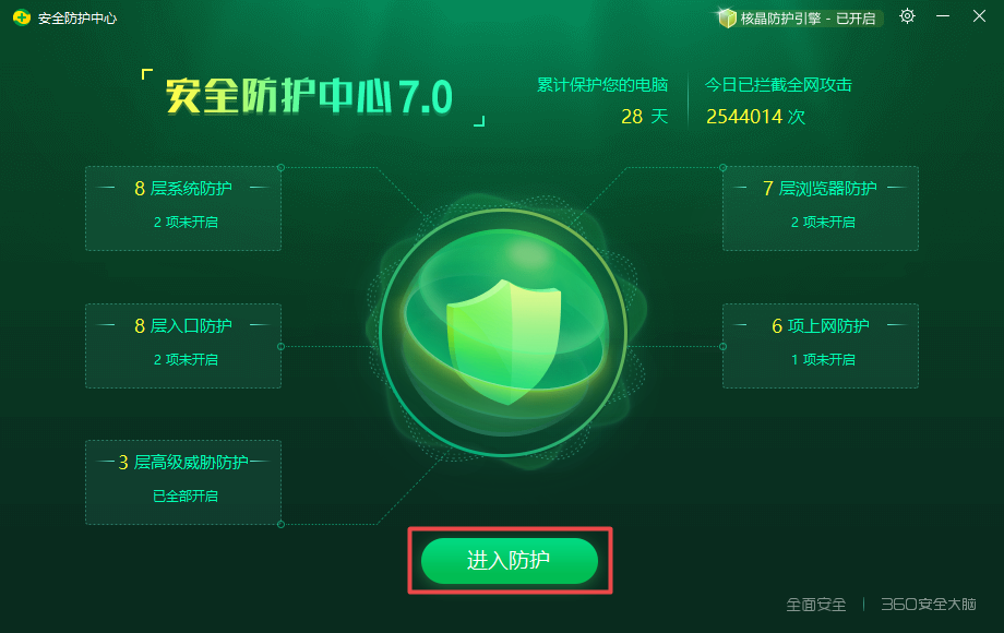 第二步,接着软件会弹出【安全防护中心】的窗口,我们点击界面中的【进入防护】按钮。
