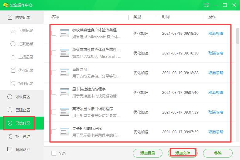 第四步,紧接着软件会弹出【安全操作中心】的窗口,在此界面的左侧,我们找到【已信任区】选项,然后其右侧的界面中就是软件所信任的软件列表了。接着我们点击界面底部的【添加文件】按钮。