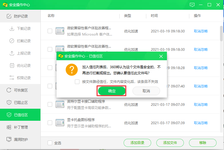 第六步,接着软件会弹出【您确认要信任此文件吗】的提示窗口,点击【确定】按钮,即可将软件添加到360安全卫士的信任列表当中了。