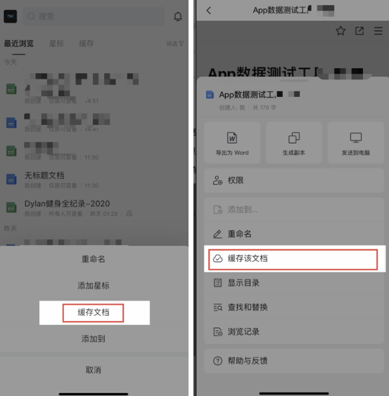 一是在文档列表左滑需要缓存到本地的文档,点击【更多】下面的【缓存文档】即可保存到本地。二是点击文档右上角的三道杠【三】按钮,然后点击【缓存文档】,这两种方法都很容易操作。