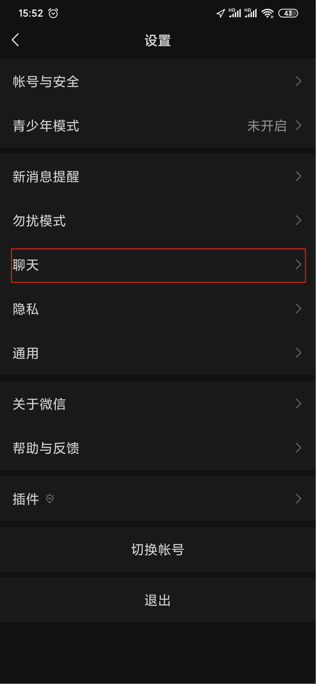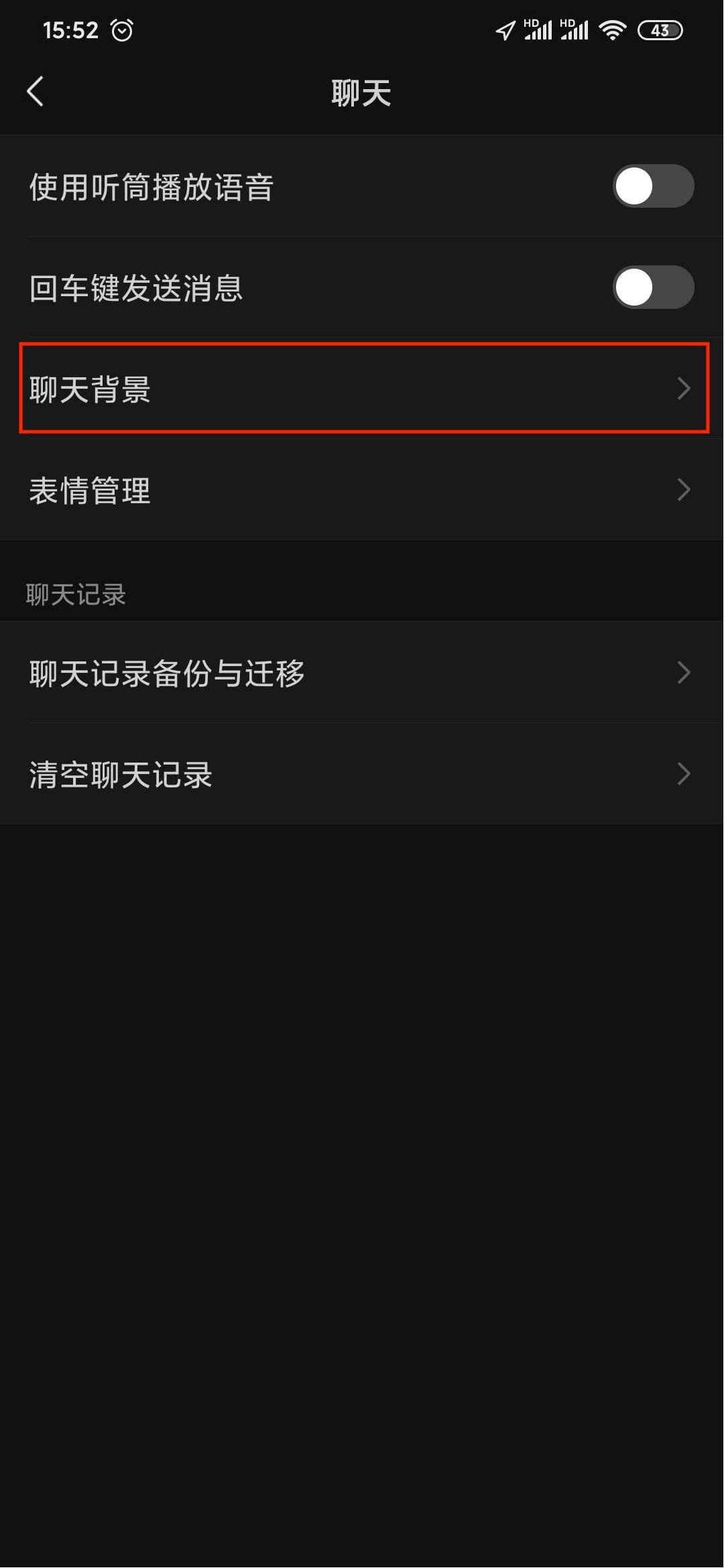 第三步,选择【聊天】选项,会进入另一个页面,在这个页面中找到【聊天背景】选项;