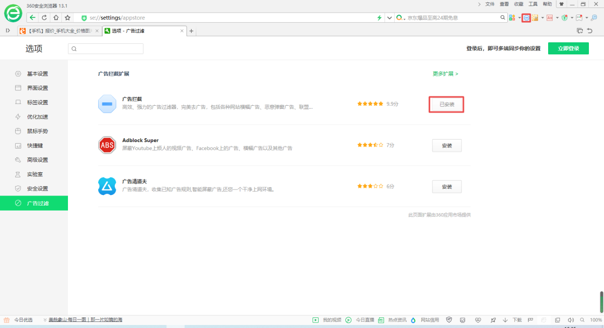 第三步,然后在右侧的广告拦截扩展界面中,找到【广告拦截】功能右侧的【安装】按钮,并点击它。