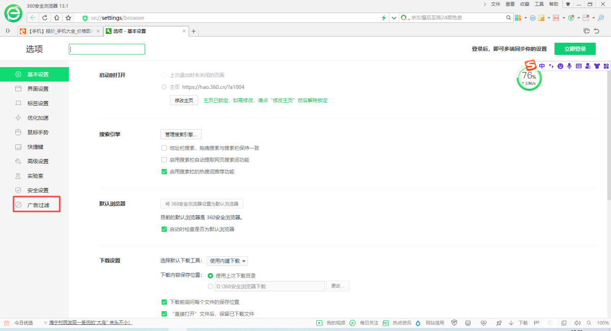 第二步,接着软件就会弹出浏览器的设置界面了,在左侧的界面中,找到【广告过滤】选项,并点击进入。