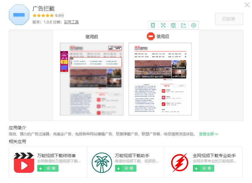 第五步,扩展功能添加好以后,在该功能的右侧就会显示【已安装】按钮,同时在浏览器右上角的位置,还可以看到扩展功能的小图标,就说明功能安装成功了,此时我们就可以放心的去浏览网页了。