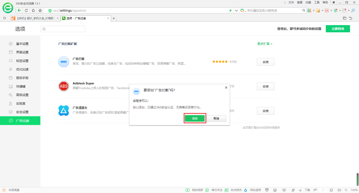 第四步,接着软件会弹出【要添加“广告拦截”吗】的提示窗口,点击【添加】按钮即可。