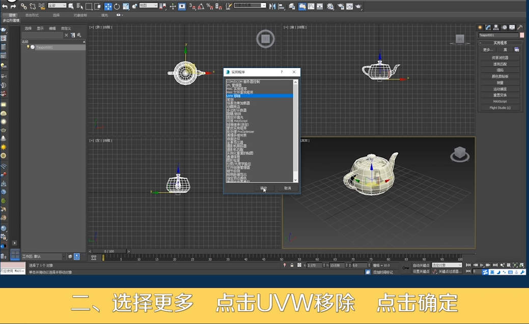 2、选择“更多”,点击“UVW移除”,点击“确定”。