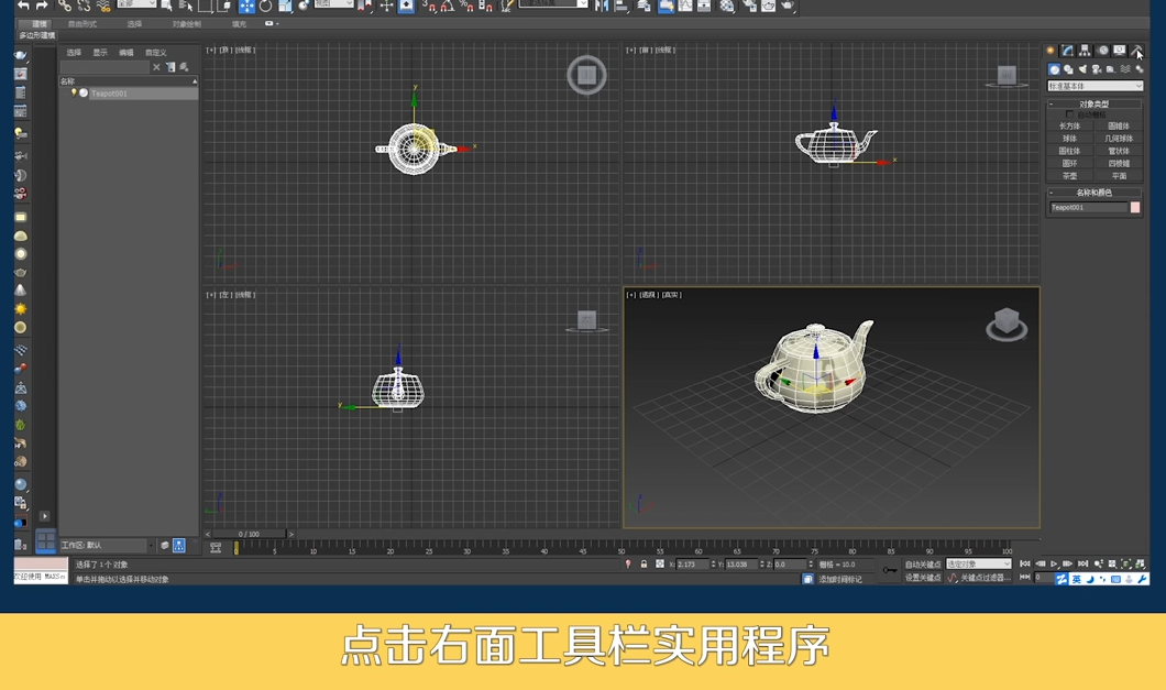 1、打开要删除贴图的模型并选中,点击右侧工具栏的“实用程序”。