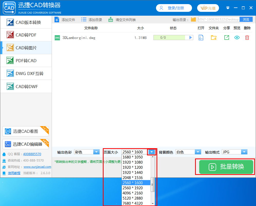 第五步,文件的保存路径选择完成后,我们找到界面最下面的部分,找到【输出色彩】选项后面的【页面大小】选项,然后点击此选项右侧的【▽】图形,然后将下拉框当中的页面大小选择为更高值,最后点击【批量转换】按钮就可以了。