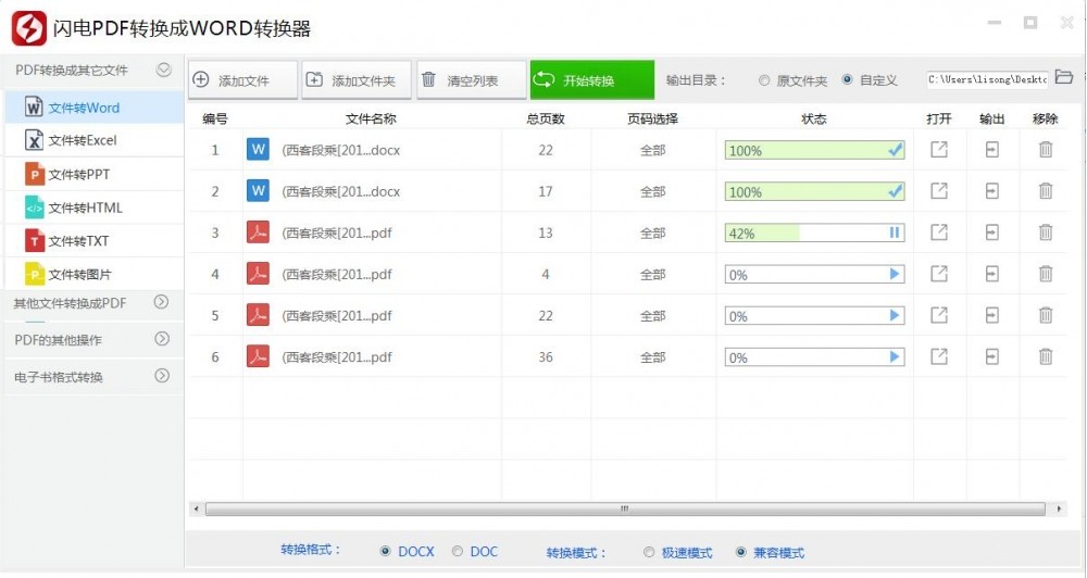 第三步,把需要转换的文件都添加到软件中来,然后点击“开始转换”。等待所有的进度条都显示100%之后,就表示转换完成了。而且闪电PDF转换器会提示转换完成,然后自动存储到指定位置。