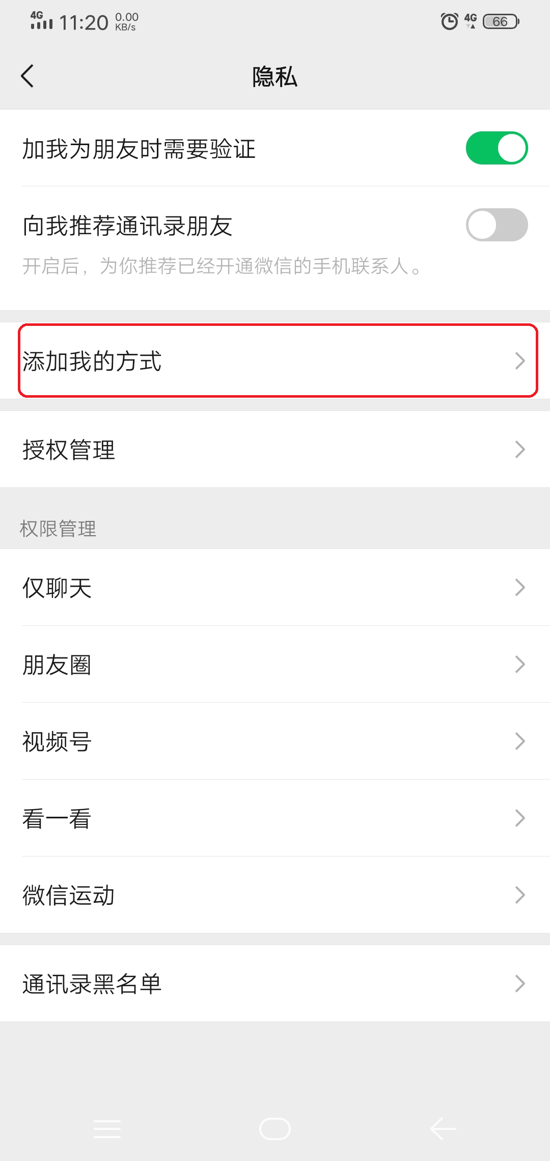 第四步,进入到微信的隐私界面后,找到【添加我的方式】选项,并点击打开。