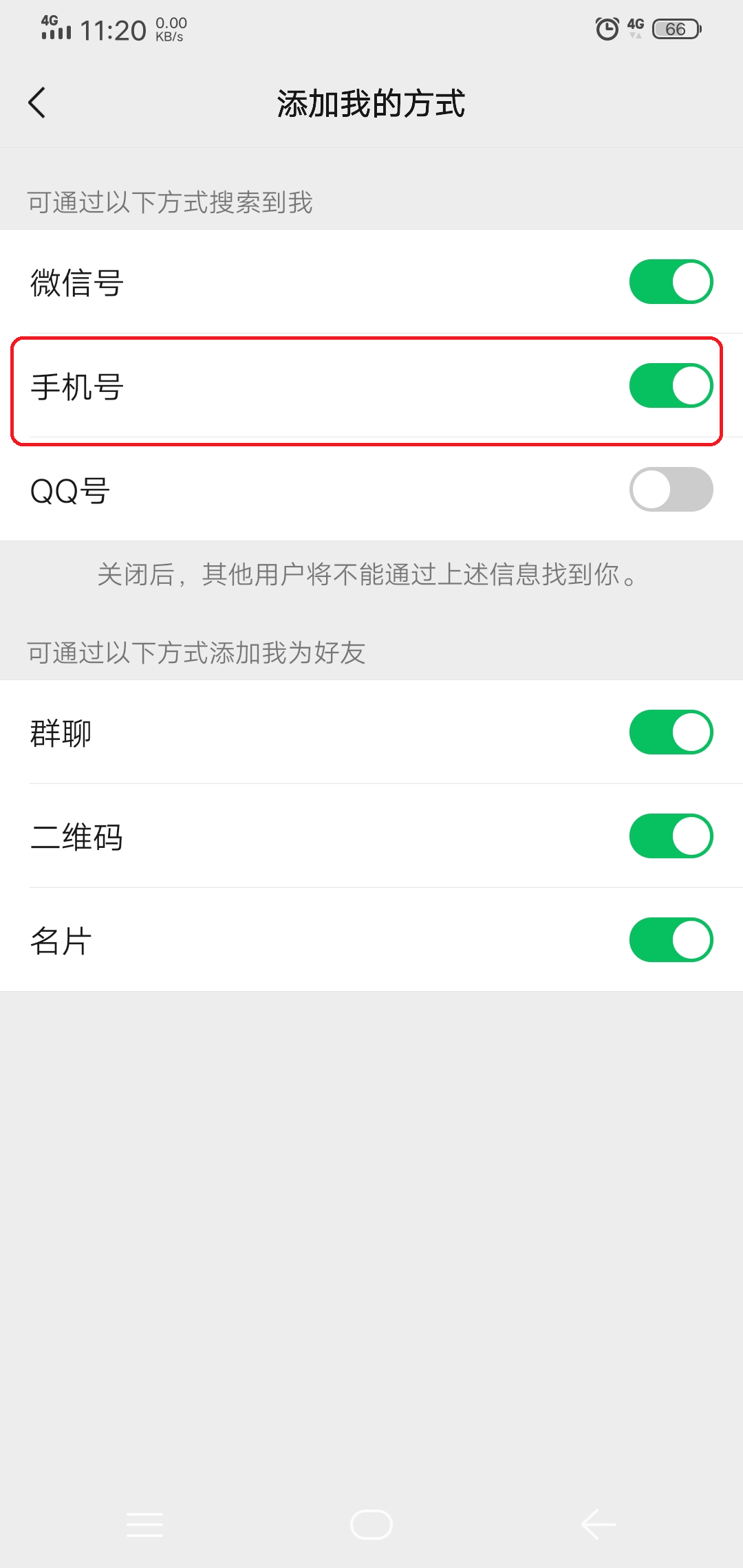 第五步,接着在添加我的方式界面当中,找到【手机号】选项,并将此选项打开即可。最后我们就可以通过手机号来搜索添加微信新朋友,或让新朋友通过手机号来加我们的微信了。
