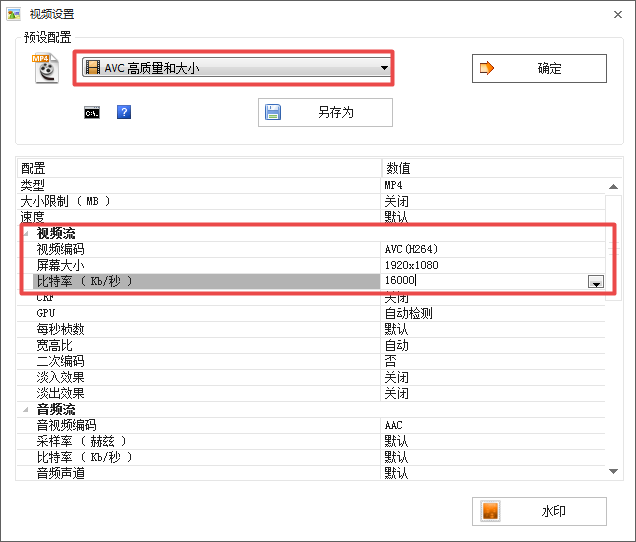 第五步,找到界面上的【预设配置】一栏,将此选项选择为【AVC高质量和大小】选项。【视频编码】选为【AVC】;屏幕大小,也就是分辨率,按照原画面的大小进行选择就行,不要小于原画;【比特率】一栏选择的越大越好,而格式工厂的比特率最大可以选择为【16000】,这对于大多数情况下的视频转换也是足够用了。而视频按照上面的参数来进行配色,肯定就是清晰的了。