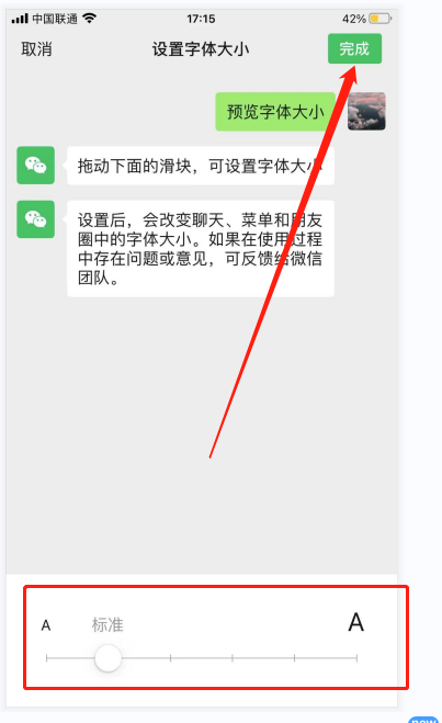 5. 进入到设置字体大小的界面后,下方点击进行调整,最后点击完成即可。