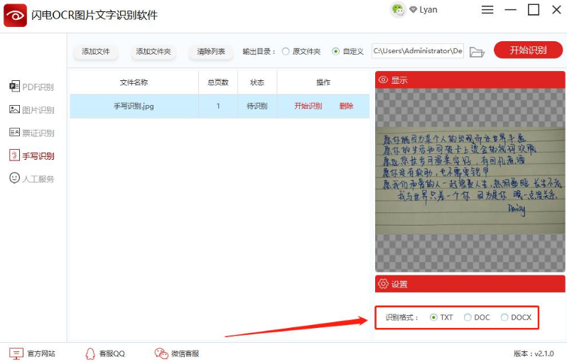 第三步,在图片下方选择转换的文档格式,有TXT、doc和docx三种格式供大家选择。