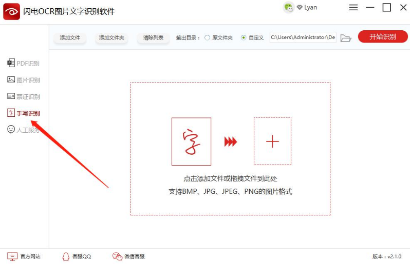 第一步,打开闪电OCR图片文字识别软件,进入主页后,在左侧选择“手写识别”。