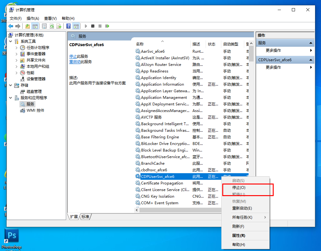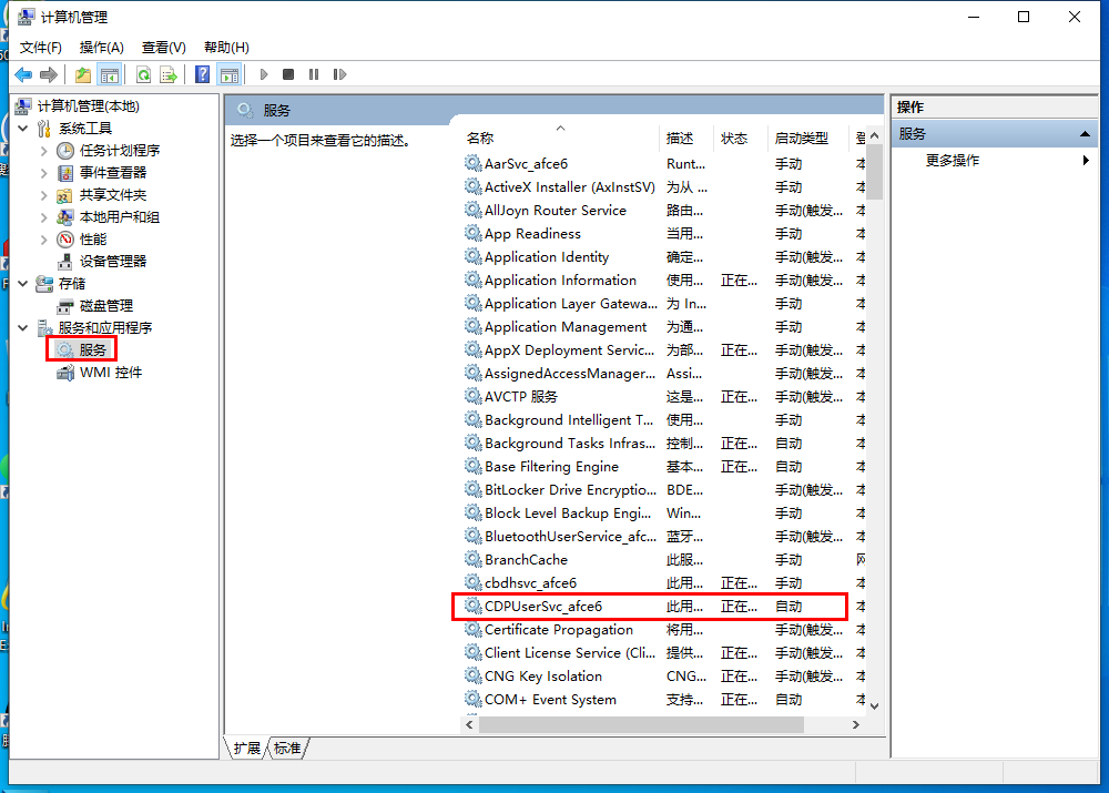 第二步,此时系统就会弹出【计算机管理】窗口,在此窗口当中,我们找到【服务】选项卡,然后点击打开,接着在其右侧的界面当中,找到【CDPUserSvc_】服务,不同的电脑此服务的名称有可能不一样,然后单击鼠标右键,选择【停止服务】。