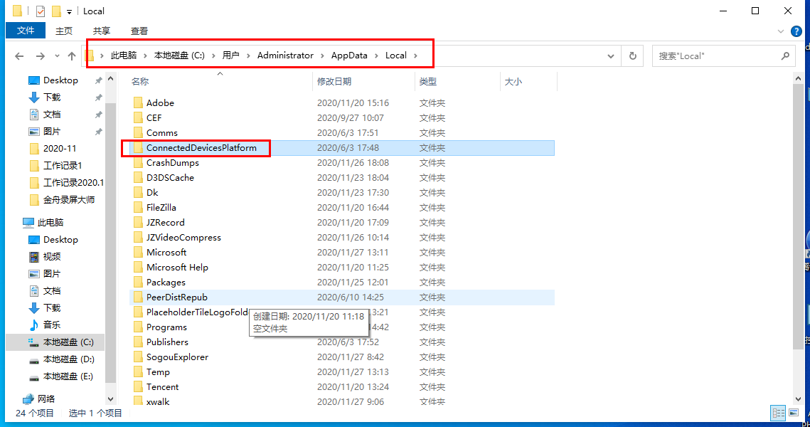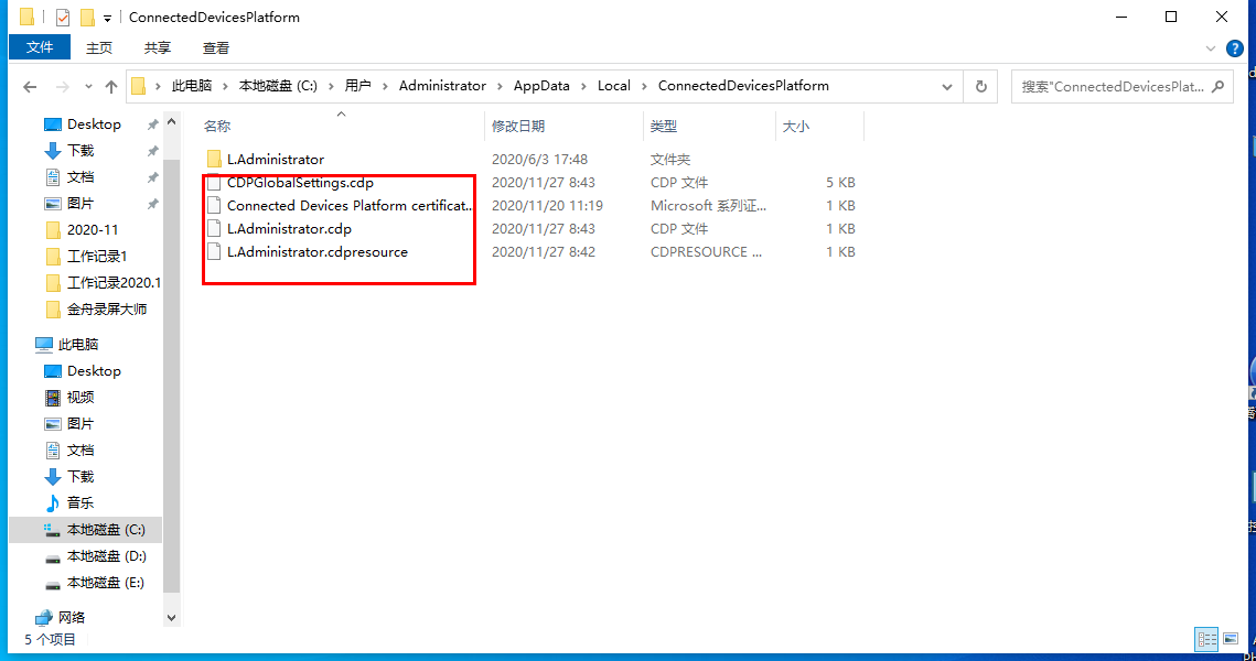 第三步,接着在电脑当中,找到以下路径【C:\User\你的用户名\AppData\Local\ConnectedDevicesPlatform】,然后找到一个字母和数字组合的文件夹,不同的电脑文件夹的名字可能也是不一样的,该文件夹当中有三个文件。