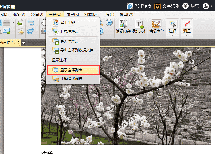 第二步,点击工具栏上的【注释】,在展开的下拉菜单中点击选择【显示注释列表】。