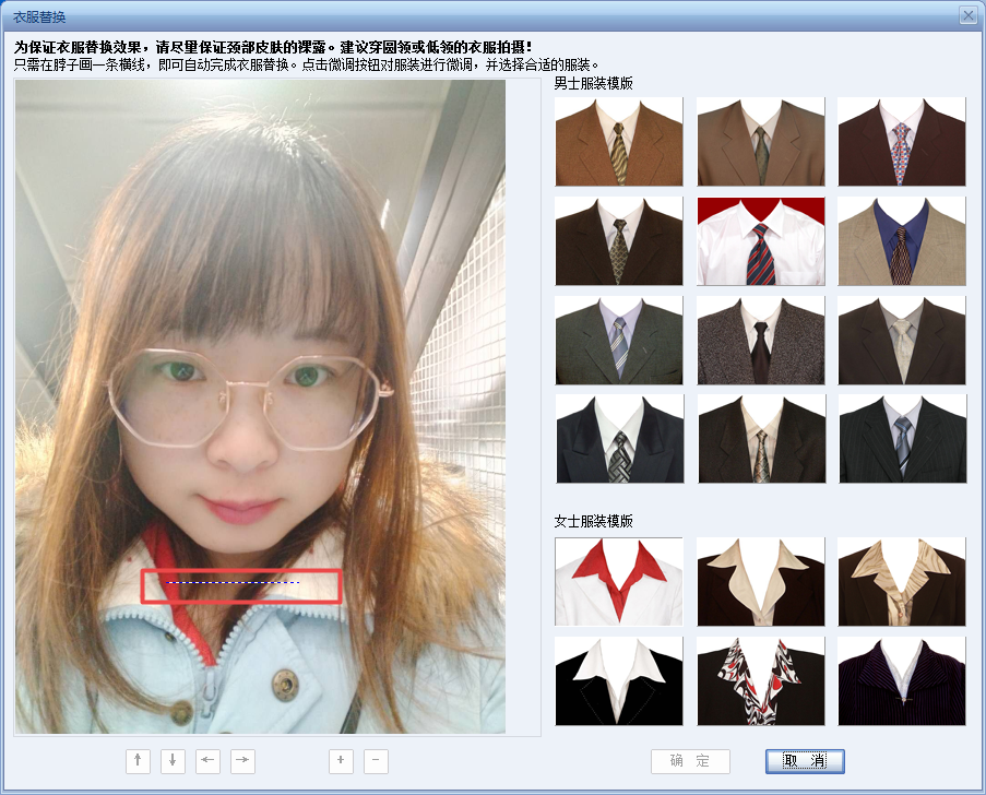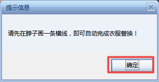第五步,此时会弹出【请先在脖子画一条横线,即可自动完成衣服替换!】的提示信息,我们点击【确定】按钮,然后在脖子上画一条横线,此时衣服就自动填充了。