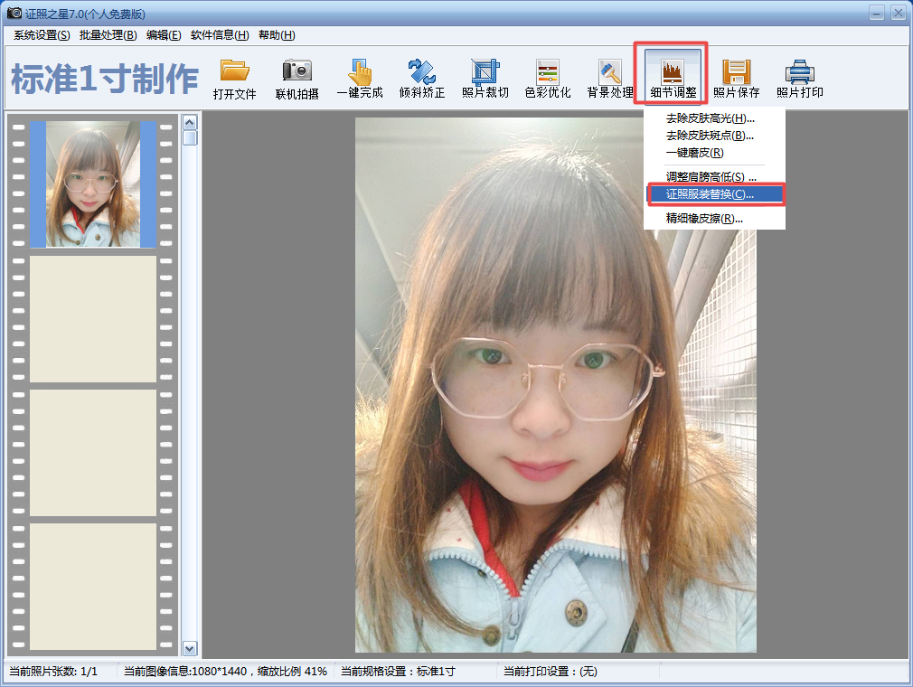 第三步,图片添加好以后,找到最上方工具栏当中的【细节调整】功能,并点击。接着在弹出的下拉选项中,选择【证照服装替换】选项。