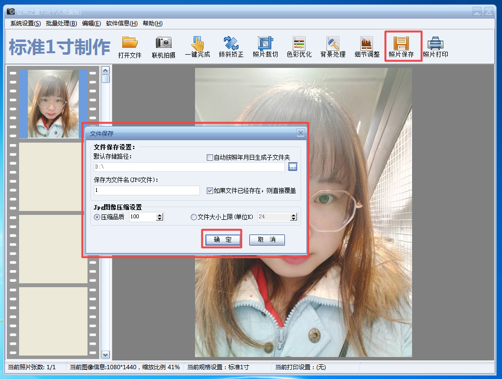 最后,将处理好的照片进行保存就可以了,保存时只需要点击工具栏上的【照片保存】按钮就可以了,在弹出的窗口中,对存储的路径以及文件名进行设置,最后根据需要设置好以后,点击【确定】按钮就可以将照片进行保存了。