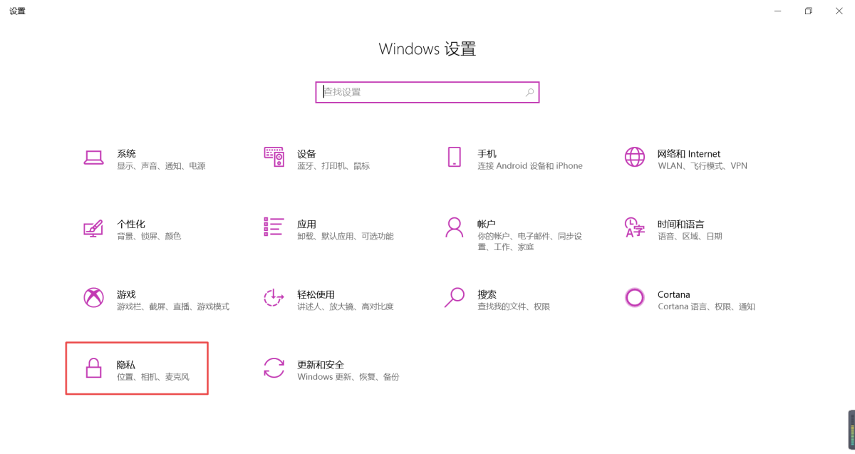 第二步,进入到电脑的【Windows设置】界面后,我们在该界面中,找到【隐私】选项,并点击进入。