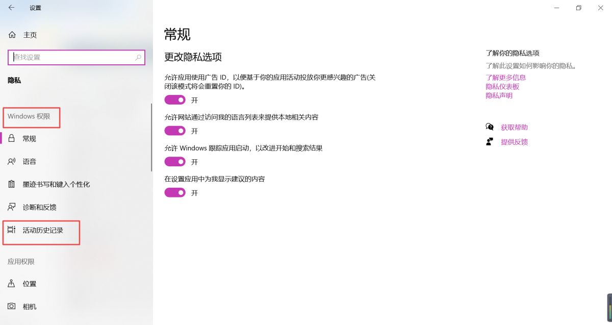 第三步,进入到电脑的隐私设置窗口当中后,我们在窗口界面的左侧,找到【Windows权限】一栏下方的【活动历时记录】功能,并点击打开。